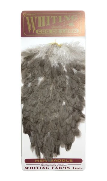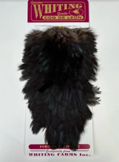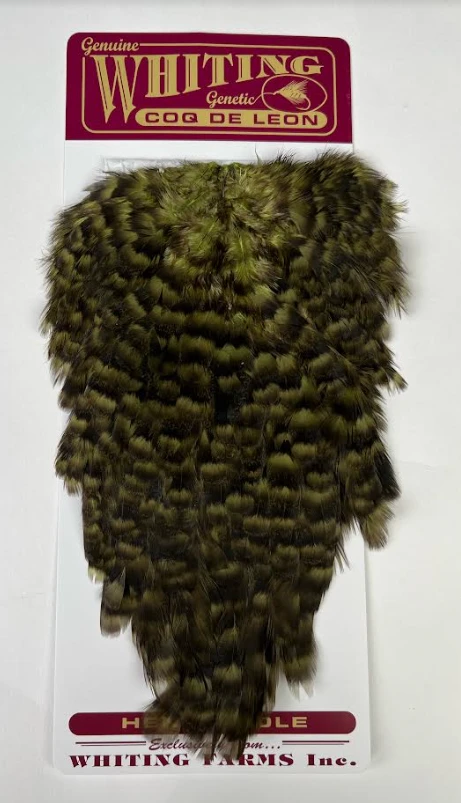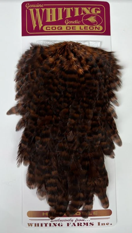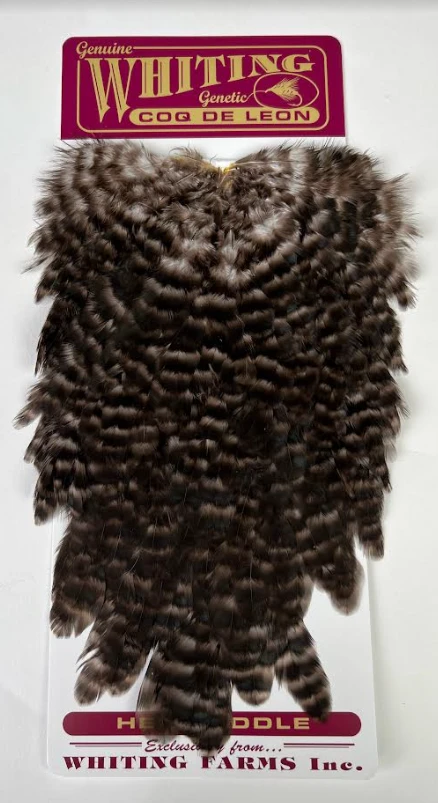 Whiting Coq De Leon Hen Saddle. This is, hands down, our favorite all-around material for tails, legs, collars and even bigger soft hackles. The colors on these saddles are absolutely amazing!