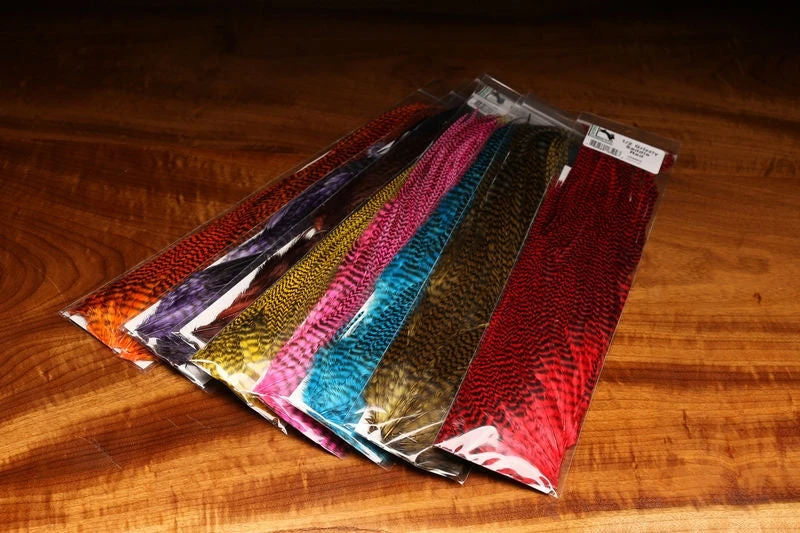 A nice grade #2 half saddle from Keough with long, narrow feathers, available in natural and dyed colors for trout, salmon and steelhead fly patterns.